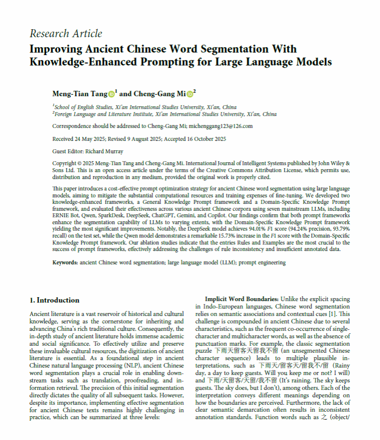 米成刚博士与英文学院本科生汤梦恬在国际学术期刊International Journal of Intelligent Systems上合作发表题为Improving Ancient Chinese Word Segmentation With Knowledge-Enhanced Prompting for Large Language Models的学术论文,米成刚博士为该论文的通讯作者。