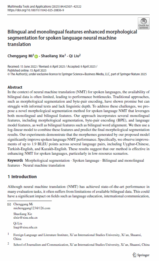 米成刚博士、谢韶亮博士,新闻与传播学院刘琪在国际学术期刊Multimedia Tools and Applications上合作发表题为Bilingual and monolingual features enhanced morphological segmentation for spoken language neural machine translation的论文。